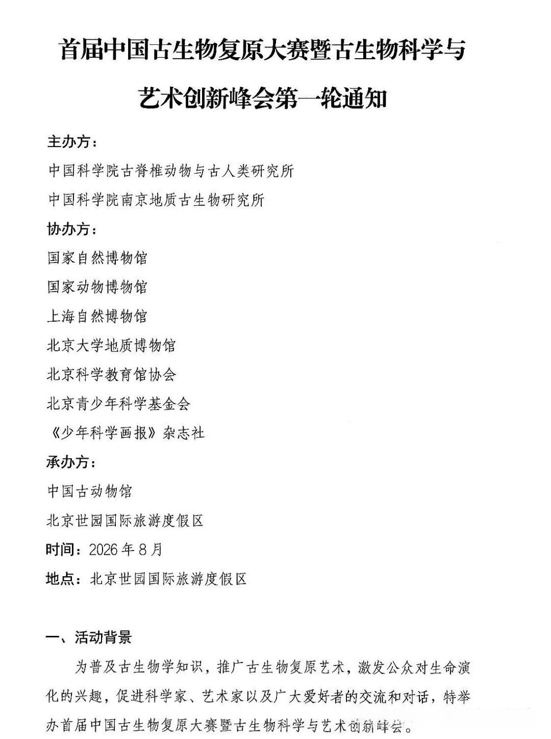 首届中国古生物复原大赛暨古生物科学与艺术创新峰会第一轮通知